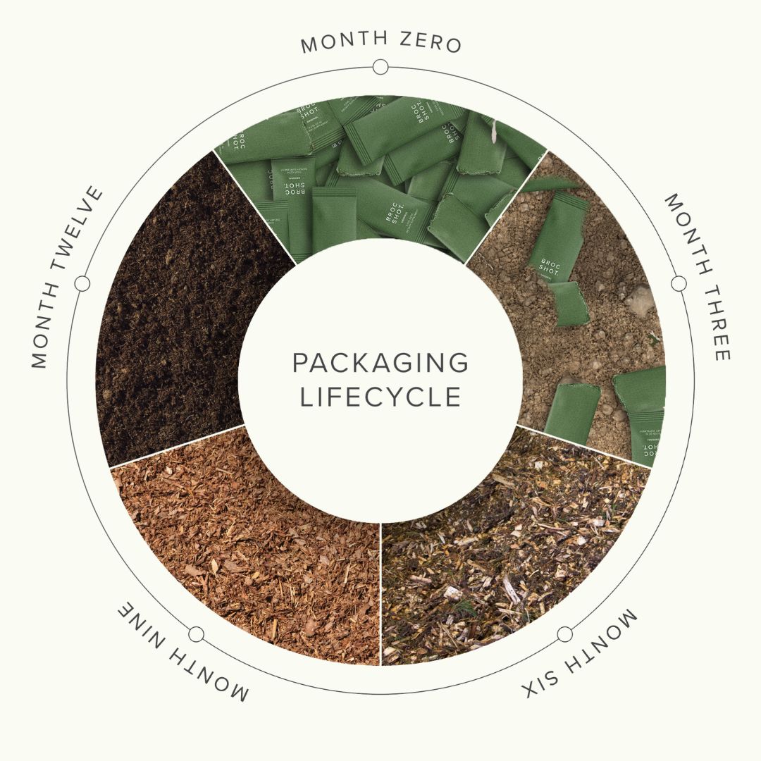 We are excited to be leaders in packaging sustainability. Our sachets are derived from wood pulp, sugarcane and cornstarch. All packaging is 100% compostable, plastic- and foil-free, and certified BPI compostable, with 90% degradation in 6 months.